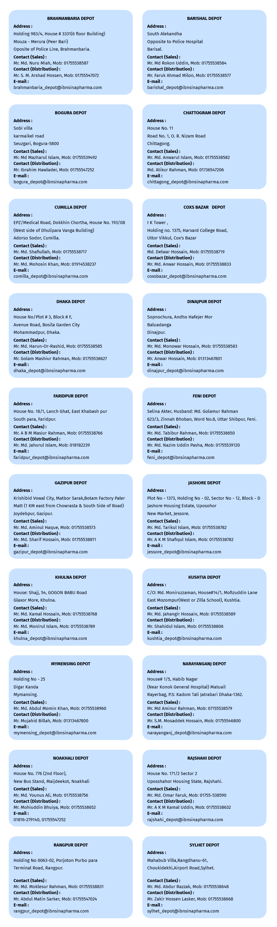IPI has its own modern distribution channel having 20 depots to reach the door of customer of the whole Pharmaceutical Market in Bangladesh. The depots are located in Dhaka, Narayanganj, Chittagong, Cumilla, Brammon Baria, Noakhali, Feni, Cox’s Bazar, Khulna, Jashore, Kushtia, Barisal, Faridpur, Sylhet, Mymensingh, Gazipur, Rajshahi, Rangpur, Dinajpur and Bogura. With this distribution network, IPI distributes the medicines to each and every pharmacy and institutions all over the country. Contract addresses of the depots are as follows:-
