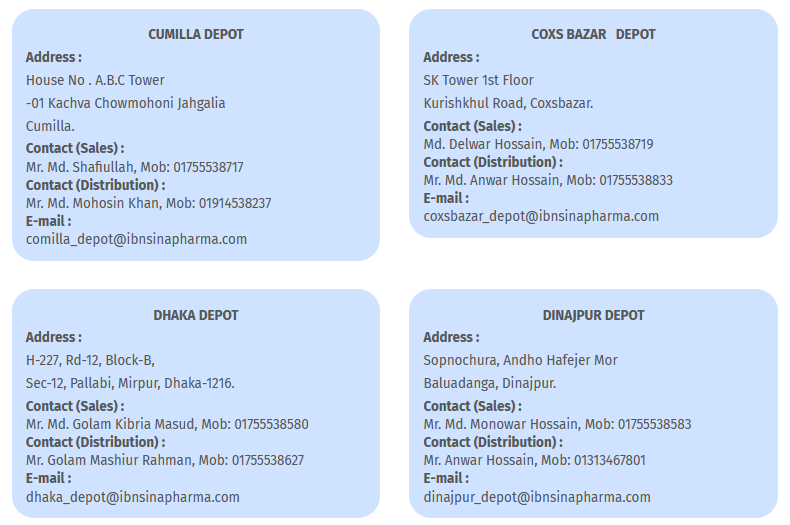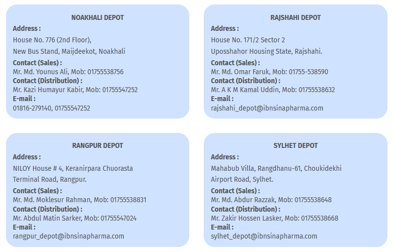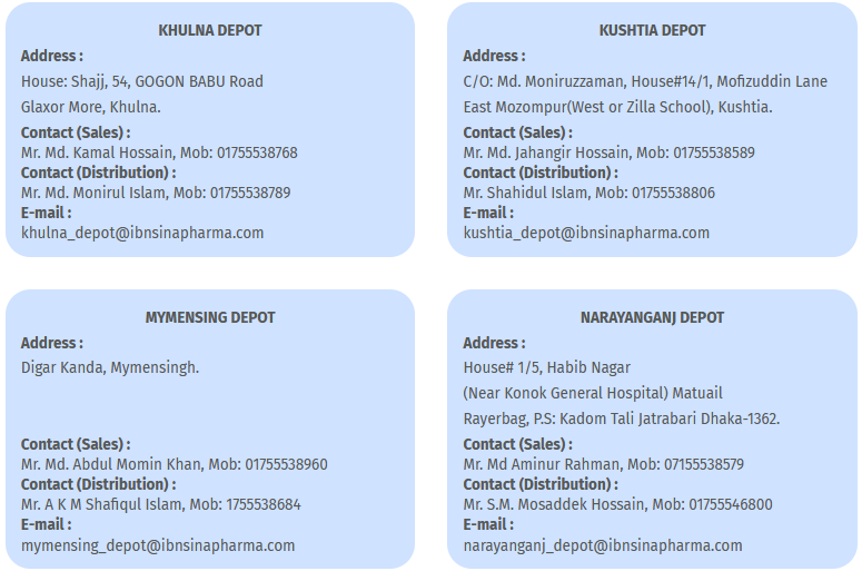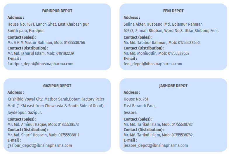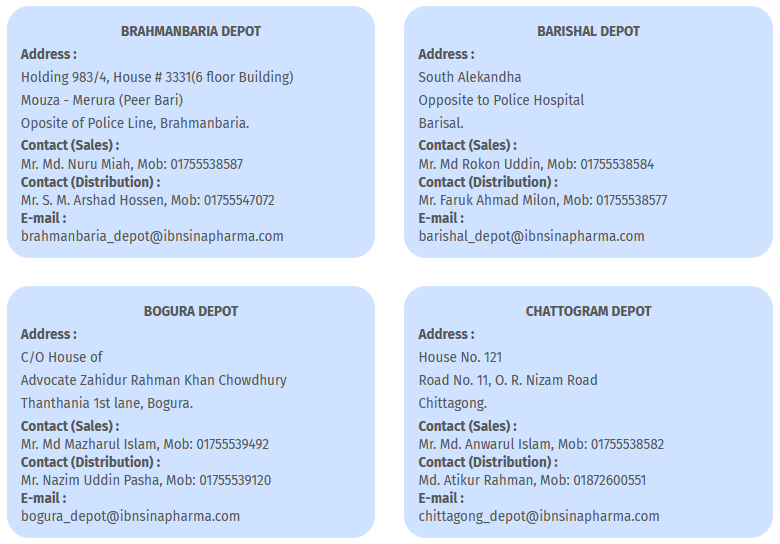 IPI has its own modern distribution channel having 20 depots to reach the door of customer of the whole Pharmaceutical Market in Bangladesh. The depots are located in Dhaka, Narayanganj, Chittagong, Cumilla, Brammon Baria, Noakhali, Feni, Cox’s Bazar, Khulna, Jashore, Kushtia, Barisal, Faridpur, Sylhet, Mymensingh, Gazipur, Rajshahi, Rangpur, Dinajpur and Bogura. With this distribution network, IPI distributes the medicines to each and every pharmacy and institutions all over the country. Contract addresses of the depots are as follows:-
